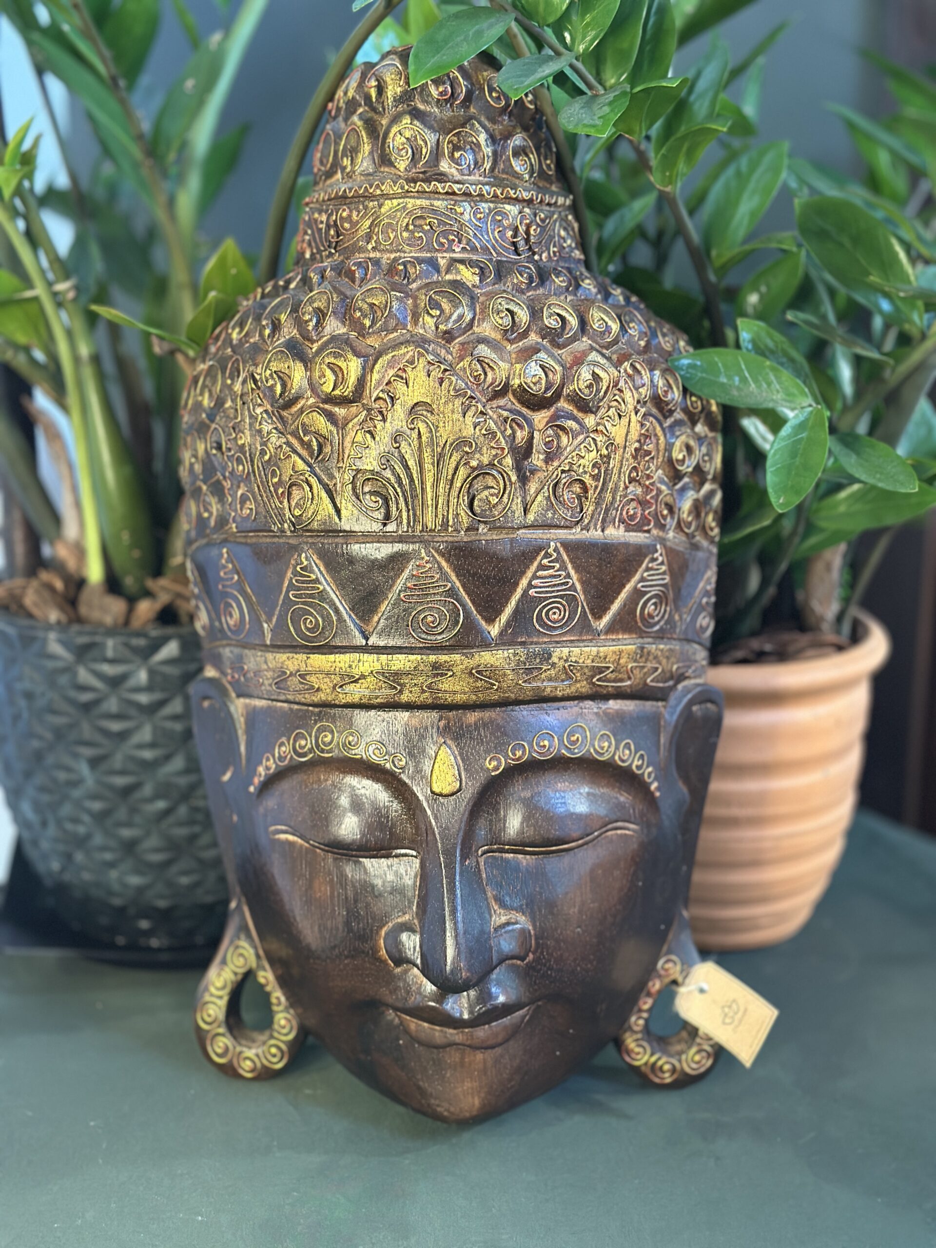 Com acabamento em tons terrosos e dourados, e adornada por delicados entalhes ornamentais, a obra transmite um aspecto ancestral e sofisticado. Sua textura levemente envelhecida confere autenticidade e charme, tornando-a ideal tanto para composições internas quanto para ambientes que buscam um toque místico e acolhedor.